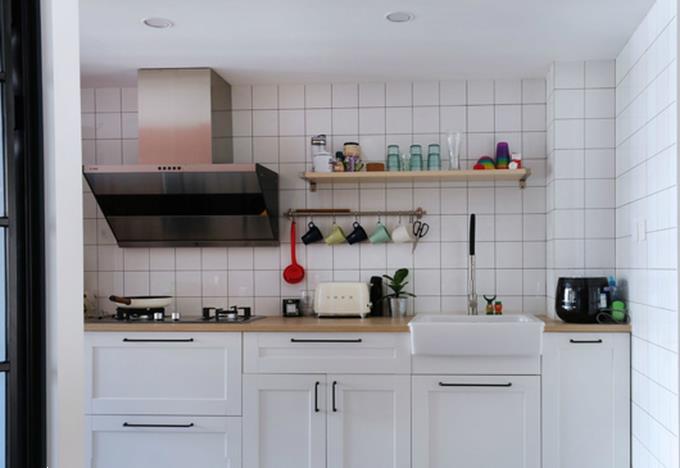 厨房主要以白色为主,整个空间几乎是浑然一体的白,为了避免视觉疲劳,巧妙的加入了一些黑色线条。比如橱柜上的把手,以及白色瓷砖上的黑色线条。除了让人舒适的线条感,也让整个空间有效避免乏味。