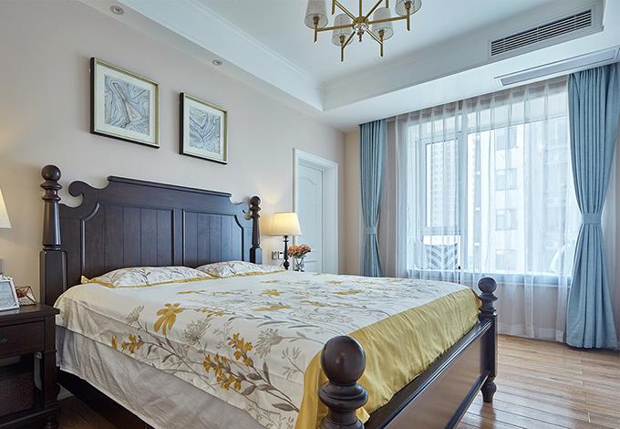 梦幻的蓝色窗帘,暖色的墙壁和木地板,深色原木大床,有着属于她的天真浪漫,也有着属于家的安全感。房顶依然是简单纯粹的白色,只有简单的壁画做装饰,让整个休息的空间没有过多的累赘,更放松更舒适。