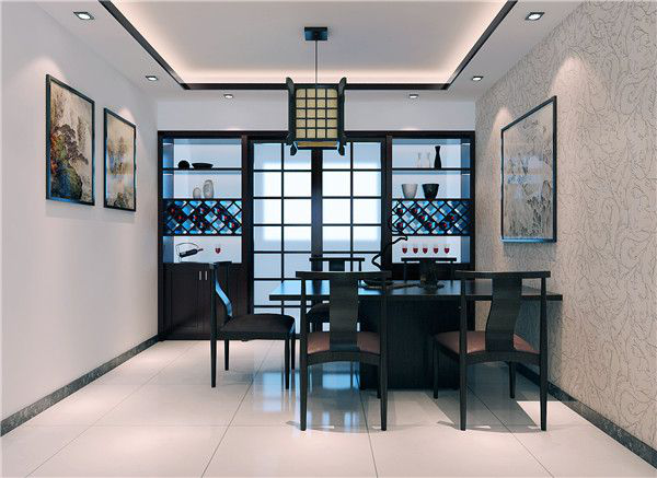 黑边的装饰画和吊顶、餐桌、隔断、踢脚线交相呼应,既保留了中式风格的沉稳,又体有现代风格的独特风味。