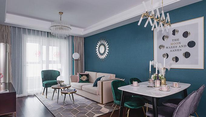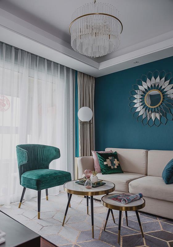 客厅透着浓浓的轻奢范,拼色地毯辅以金色线条做装饰,和桌椅的金色相得益彰。素色的沙发让客厅增添了几分淡雅、孔雀绿的抱枕又让沙发不至于太单调。沙发背景墙上的装饰造型独特,金属光泽点亮蓝绿的墙壁,镜子能在视觉上增强空间感。