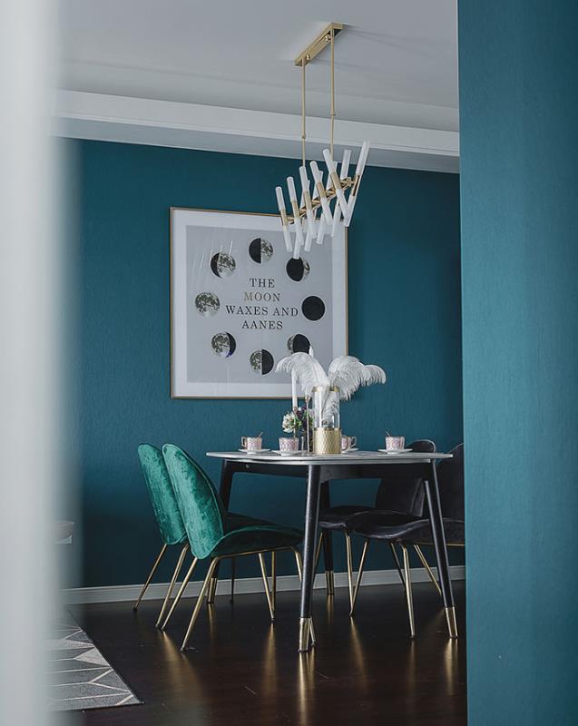 从这个角度看餐厅,整个餐厅基本都被孔雀绿承包了,蓝绿色的墙壁雅致而有格调。深色地板映射出香槟金的光,桌椅设计简约,用色大方优雅。墙壁上一副简单的壁画做装饰,香槟金相框和蓝绿墙壁搭配更显高贵。