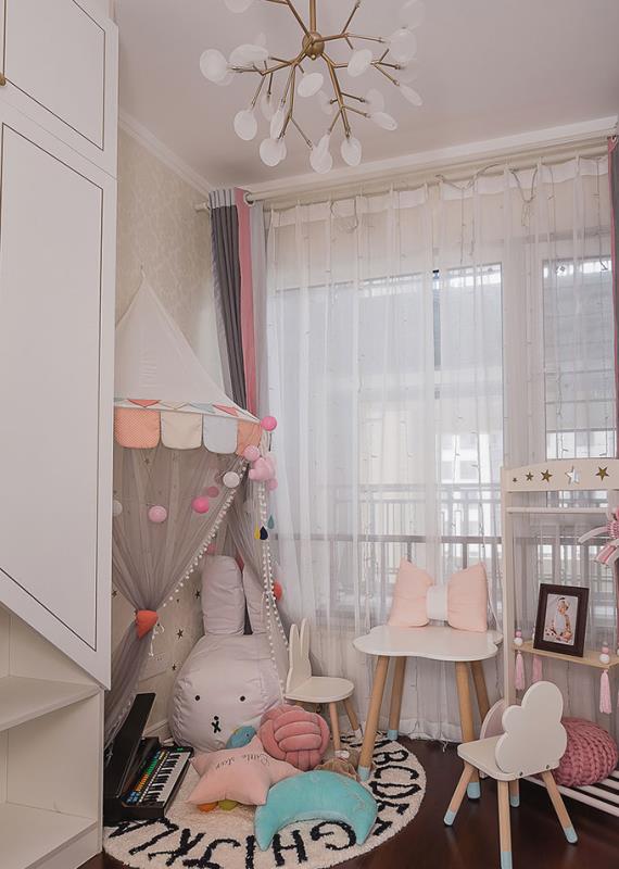儿童房放弃了传统的设计,小公主娱乐的一角透露出爸爸妈妈对她的爱。不是常见了满屋子的粉红色,而是用了极其淡雅的几种颜色,搭配出了一个清新、可爱又温馨的空间。彩色的小夜灯、蝴蝶结、星星和月亮,这是一个属于精灵的世界。