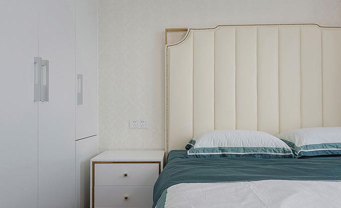 不同于客餐厅的浓重色彩,卧室整体没有延续之前的风格,反而是相对比较素雅。从衣柜到床头柜、再到墙壁,基本都用不同程度的白色,让整个空间简约而有格调。床上用品则是比较点题性的用了孔雀绿色,更加亮眼,有搭配感。