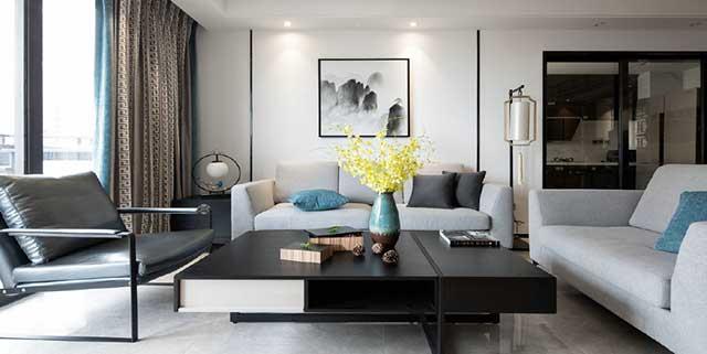 在中式里,家具的线条往往比较干净利落,没有那么多的柔和感,该有棱角的地方棱角分明。也不会用到太鲜艳的色彩装饰,例如这个客厅,以灰白黑三个中性色彩为主,整个空间淡雅低调。而那一点蓝色和一抹黄恰到好处的做了装饰。水墨画也是中式装饰中最常见的一个元素,表面上看上去它没有那么的精美与精致,但是简单几笔水墨就是让中式意味更浓几分。