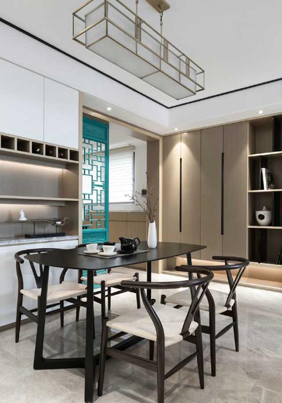 中式的餐厅其实是相对朴实的设计,一般不会出现太华丽的酒柜,也不会出现造型别致而吸晴的桌椅。中式的桌椅都是比较常见的,颜色无非红、黑、木色三种。椅子的造型贴合人体工学设计,桌子重视简约通透之感,让不大的餐厅不会有狭窄厚重之感。装饰以中式元素为主,摆饰、窗棂都有着传统的味道。