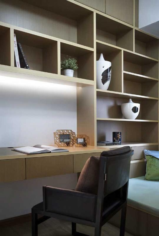 书房作为一个学习工作的功能区间,以舒适清幽为主,其次就是收纳性。大大的书架还没有摆上书,摆了一些瓷瓶和绿植,有着小情趣。书桌不大,但是学习工作很实用,椅子加了软垫,非常舒适。另外书房为榻榻米设计,既可以自己小憩,也可以招待客人,还是相对实用的。