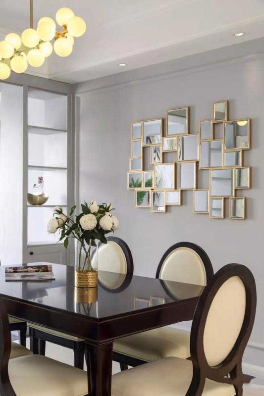 客餐厅互通,以吊顶和背景墙来划分不同的功能区域,金属边框的不规则镜子,活跃氛围的同时,点亮单调的背景。