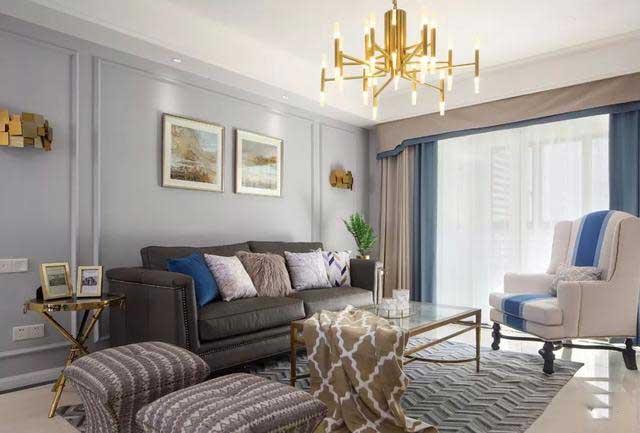 灰色沙发背景墙,搭配金色元素家具,低调与奢华相互平衡,带来别样的美式感受。放弃传统美式繁杂造型,改用简单的线条划分,金色与灰色呈现大气简约格调,符合当下年轻人的审美。