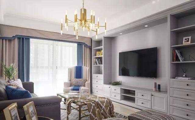 灰色调的电视背景墙,兼具储物柜功能,收纳功能十足,对称的造型让空间感更为有序。