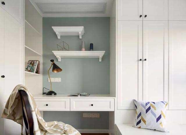 榻榻米兼书房的设计,一面浅绿色背景墙,制造出清新的视觉,可供家人一起休闲娱乐,在有客人来时,也可兼顾客卧的功能。
