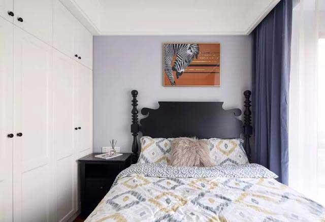 次卧,背景墙与窗帘,采用同色调深浅搭配,纯黑色美式大床搭配白色储物柜,橙色斑马装饰画点缀空间,色彩搭配很舒服。