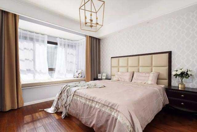 主卧,暖色系地板与窗帘搭配,卡其色高背床与金色元素软装,柔和色彩给人舒适的视觉感受。浅色系的几何图案壁纸,衬托出美式家具的质感,床品也以舒适为主,体现轻奢美式的细节。