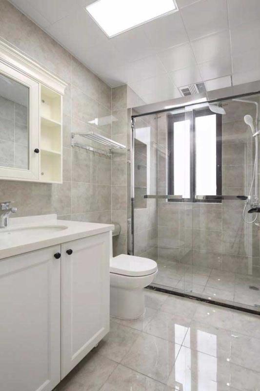 卫生间里,浅色系的运用搭配大理石瓷砖让整个空间变得更为简约明亮,干湿区分离,淋浴区立面设计壁龛方便置物,美观实用。z