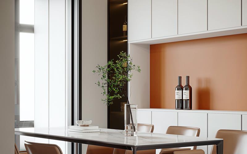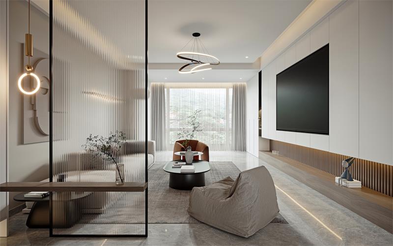 滇池澜庭案例以浅白为主色,搭配滇池景观特有的“湖蓝”作为点缀色,通过大面积落地窗引入室外自然光线,让空间更显通透开阔,同时呼应“澜庭”的临水属性