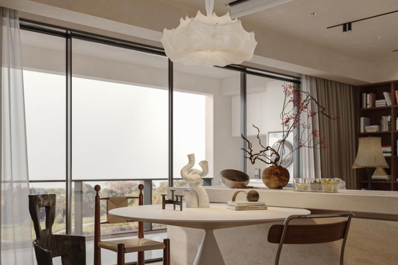 客厅放弃了传统的厚重茶几,用简约的低矮边几搭配云朵感的布艺沙发,窗外的滇池风光成了最好的背景墙;餐厨区做了开放式设计,实木餐桌旁的吊灯选了线条感的艺术款,朋友小聚时,烟火气和设计感总能恰到好处地融合。