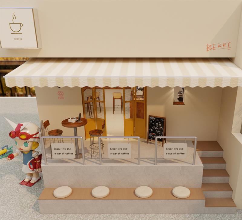 门口的潮玩雕塑成为点睛之笔,为静谧的空间注入鲜活趣味,吸引路人驻足打卡。整体设计在质朴与精致间取得平衡,让每一位访客都能在咖啡香气与松弛氛围中,找到属于自己的城市疗愈时刻。