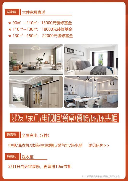 装修放心,居住安心,值此五一劳动节到来之际,久居装饰推出五一装修优惠活动,凡515前在久居装饰定装修的业主,赠送全屋家具家电,具体赠送如下: