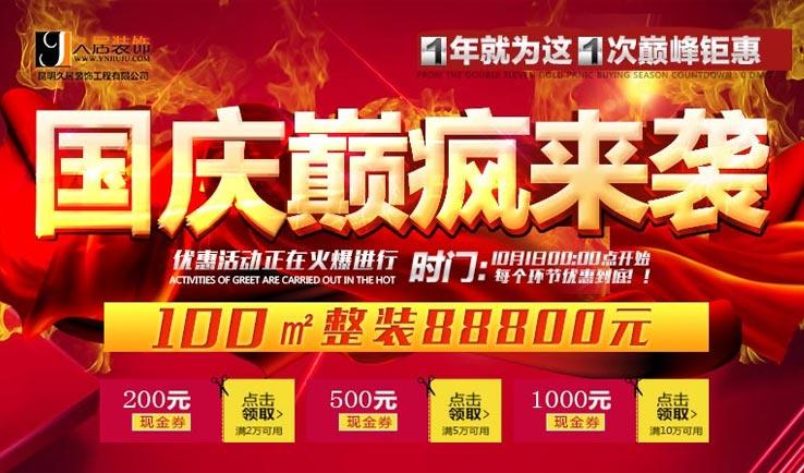 国庆小长假即将来临,本想来一场说走就走的旅行,但是房屋装修咋个整?昆明人的福利来袭!久居装饰,喜迎国庆、巅疯钜惠,定装直省8万元!品质设计、一线主材、精准工期,一站式省钱、省时、省心、省力!年前就可享受舒适新家!活动期间,签单更有多重惊喜!