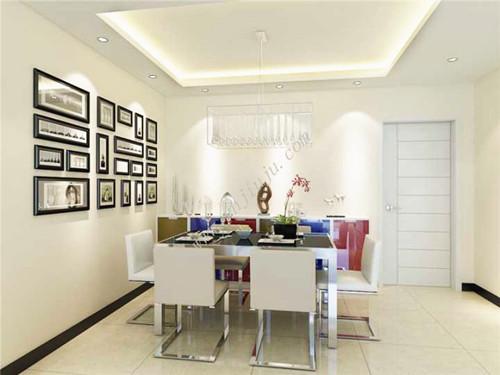 推开房间的门展现在眼前的便是温馨简单的空间,以白色为主的格局搭配上暖黄色的墙面装饰,白色与黄色的结合,以安静衬托温馨,二者互为搭配构成最温馨的家居空间。进门的墙角处色彩斑斓的柜子为单调的空间渲染的靓丽的色彩,在空阔的墙面上悬挂着的相册成为餐厅空间的亮点,也为家人圈出一面回忆的墙壁,倍感温馨。简单勾勒的吊顶上设置的吊灯散发出柔和的光芒,下垂的水晶吊灯拉伸空间的距离感。略带金属质感的白色餐椅符合空间的主色调,也将现代金属工艺的冷冽质感带入空间。黑色的踢脚线将暖黄的墙壁和白色的地砖划分开,构成别致的色彩空间。