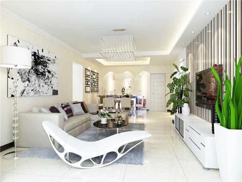 开放的空间将餐厅与客厅完美的结合在一起,穿过餐厅便步入到客厅之内,客厅遵循空间的主色调,在其中加入不同的色彩做点缀,简单而精致。浅黄色的沙发与空间的色调互为呼应,墙上黑色渲染的图画折射出艺术的气息。灰色的地毯划分出娱乐的空间,黑色的圆形茶几与长方形的电视柜形成鲜明的对比,最别致的当属不同色彩勾勒而成的电视背景墙为空阔的空间增添了别样的美感,在简单的空间内凸显出美丽的色彩。盆中的植物随风轻轻浮动,为空间带来自然的清香。