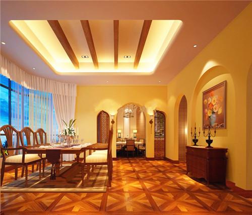 见惯的小格局的餐厅,对于大空间的餐厅更有向往之感。仿古瓷砖片片拼贴而成地面空间与周围的墙面形成鲜明的对比,渲染出美式风的历史感,犹如夹带着乡村间泥土芬芳的气息。实木的框架将吊顶空间划分为矩形的空间,突出了空间的层次感,除却几盏小小的吊灯再无其他多余之物,整个空间显得干净利落。弧形黑色实木框架的落地窗搭配白色的帷幔与窗帘显得轻盈灵动,浅色系的地毯划分出用餐空间。墙上的拱形空间嵌入一幅实木框架的油画,与下方古朴的条几构成一体。美式风格不可或缺的便是木质装饰,长方形的餐桌依然遵循业主的自然情怀。两扇对称镂空的拱形门、两盏复古的烛台在现代的空间之内显示出悠久的气息。给主人优雅温馨的用餐空间。