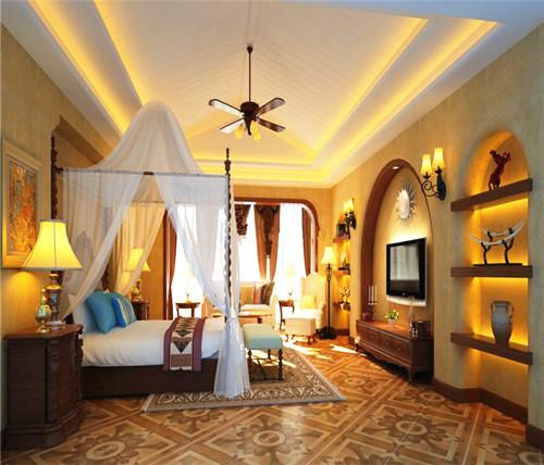 卧室的以安静温馨为主要布局,简洁的吊顶显得尤为突出,大面积的用白色渲染。以长方形构成两个层叠的框架,从而呈现出立体的空间,使得空间的层高瞬间拉长,拉长悬挂多的扇形吊灯拉伸了视觉感受。周围空间的暖色调营造出温馨的氛围,墙壁之上拱形的功能分区作为电视背景墙与装饰面板节约了不少的空间。菱形的复古地砖与古老图案的地毯带来美式乡村的即视感,白色吸顶的蚊帐将异域风情带入居室之内,隐隐的透露出浪漫的气氛,也保护了主人的隐私。独具匠心的卧室设计用流畅的线条勾勒出框架加上复古元素的装饰,浪漫优雅又不失温馨格调,打造出功能性与舒适度并存的卧室环境。