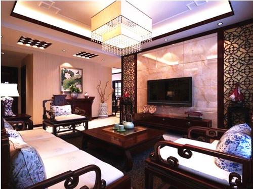 电视背景墙作为整个居室的中心视点,其设计装饰充分体现出中式风情。中式风格的电视背景墙讲究的是对称和谐,大理石瓷砖拼接而成的平面在实木原色的映衬下显得清新淡雅,为深色的空间带来一抹自然清香的气息。木质材料自然是中式背景墙的首选主材,实木造型显得古朴怀旧,在两扇隔栅之上镂空雕花的工艺散发出浓重的历史气质,彰显出中式风特有的古典韵味。造型古朴的电视柜加上中式特有的瓷器摆件于细节之处展示中式气韵。