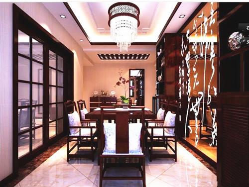 餐厅设计遵循了中式风格的典雅,白色的仿古砖上些许的黄色渲染更显别致,上方实木线条构成的吊顶下悬挂的镂空花纹的水晶吊灯愈发的迷人,也为中式空间注入一抹现代元素。实木框架镶嵌而成的推拉门节省了室内空间,与之对应的便是餐桌旁的镜面装饰,上方的潇洒大气的书法正是中国古典文化的经典传承。长方形的实木桌椅搭上浅色系的软装淡化了红色实木带来的压抑之感,也使得空间之内的色彩更加柔和。在这样的空间之中用餐时也能感受到中式文化的底蕴。
