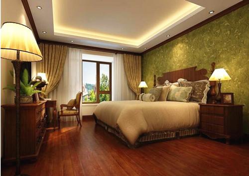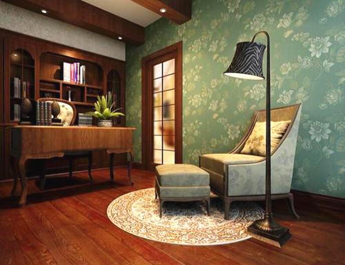 书房的布局则是中式与现代的完美结合,堪称中西合璧的典范。推开实木框架的玻璃门踩着实木拼接而成的地板步入到书房之内。墙体用松柏绿的现代壁纸张贴而成,外加淡雅的白色花纹,在浓重的色彩中透露出淡雅的气息。头顶空间用实木勾勒摒弃了色彩单调的平面空间,实木的书架之上摆放的书籍与长方形的书桌完美契合,彰显出主人高雅的情怀以及丰富的文化内涵。在精致的圆形地毯之上一根躺椅一盏复古造型的落地灯,在书香空间中散发出它独有的现代韵味。