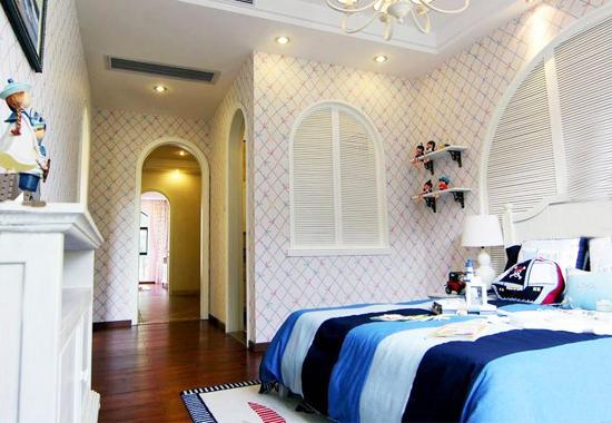 顺着红木地板,穿过高深而又小巧的拱形门,来到一个藏着梦幻海洋色彩的儿童房,粉蓝线条交织的壁纸,犹如从陆地飘来的粉色蒲公英,荡涤在大海的上空。纯白半圆的窗户造型,令人心生遐想,打开这样的一扇窗,是否就是大海的世界呢?蓝色系条纹的床品,很生动的将大海起伏波动的线条留在卧室内,这样充盈着灵动与自在的卧室氛围,想必孩子更能喜欢。w