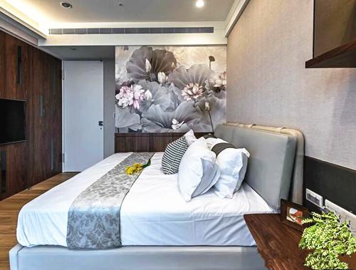 卧室空间独有一番雅致气韵,简单布置的卧室空间寥寥的的古典元素在简约大气的同时不失温婉柔美,吊顶空间用现代材质的线条勾出整体的框架,白色的主体搭配灰色的线条在空间内别具一格。实木地板铺贴的地面与电视背景墙连成完整的一体,将中式的木质元素运用到极致,一幅巨大的荷叶壁画在空间内更显素雅。空间无过多的装饰品环境更加通透简洁在这样的卧室内突出新中式柔美含蓄的气息。H