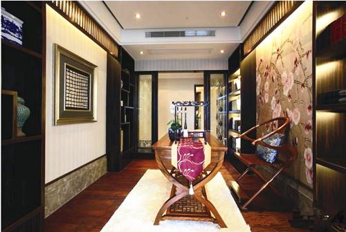 书房的布置以安静为主,适当的加入文化气息熏陶。在简单的白色墙面之上利用实木做出一道窗户,上方空间的栅栏更显文艺,在墙角处利用壁纸做旧处理形似传统石板装饰的墙面,给人呈现出怀旧的感觉。实木地板与长型的书桌构成完美的一体,搭配造型古朴的圈椅显得古色古香。背后一幅仿古的梅花图为空间增添古韵,也显示出居室主人的高洁的品性以及文化品味。