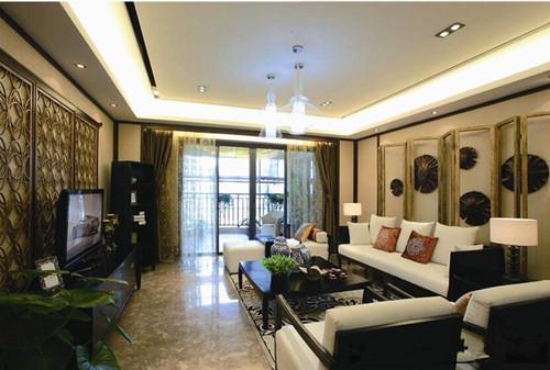 日韩风格的居所在唯美之中透出自然的气息,让人不由自主的想要靠近。简单硬朗的线条勾勒成的吊顶摒弃了常用的水晶吊灯带来的审美疲劳,别处心裁的运用两盏对称的透明吊灯在空间内更显新颖灵动,周围隐藏的壁灯散发出柔和的光芒也充分满足空间的照明需求。实木镂空的屏风作为电视背景墙更显淳朴自然,黑色的电视柜与空间内的黑色元素相互呼应。与之对应的是白色沙发后实木框架镶嵌质朴花纹的浅色屏风为空间带来厚重的文化气息。黑色实木的椅子搭配白色的软装既有文化感也不失舒适,黑色的实木方桌与纯白和红色的软装形成鲜明的对比。利用玻璃式的推拉门将阳台与室内空间一分为二,浅色的帷幔遮挡了来自室外炙热的光线。