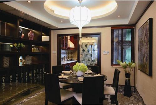 餐厅的设计遵循空间的整体风格,大面积的运用实木装饰,透露出自然优雅的气息。餐厅色调与白色的吊顶和暖黄色的墙面为装饰主体,吊顶空间别处心裁的运用拱形做顶而周围隐藏的壁灯衬托着中心不规则的吊灯,黄色光芒与白色光芒相互掩映。利用木质的推拉门把厨房与餐厅分隔开,一扇实木框架的窗户搭配深色的百叶窗室外景色显得隐隐绰绰。墙面上悬挂的巨大艺术画透露出文艺的气息。黑色实木的圆桌搭配同色系的椅子显得质朴,墙角处的一束白色荷花与桌上的插花形成完整的一体为居室带来自然的芬芳。