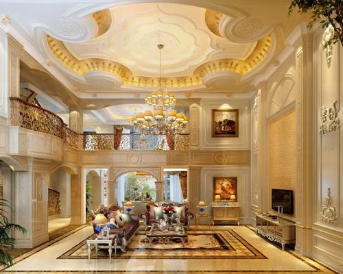 2、顶部还可以做一些装饰,如采用石膏雕刻一些简单的造型,这样顶部更有层次感。不过需要注意一点,挑高的客厅不宜选择做天井造型的吊顶,以免形成压抑感。