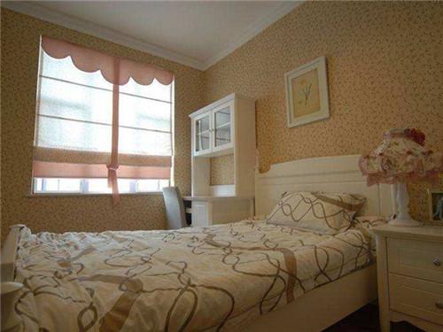 卧室里摆放的主要是床,厚实高挑的床体牢牢占据卧室中心,保证了卧室最主要的功能性。可以在床头上用图案精美的墙纸来做遮挡,这样也是床头背景墙的打造,紧靠窗边一方矮矮的边柜充当床头柜,可以提供零碎收纳空档!