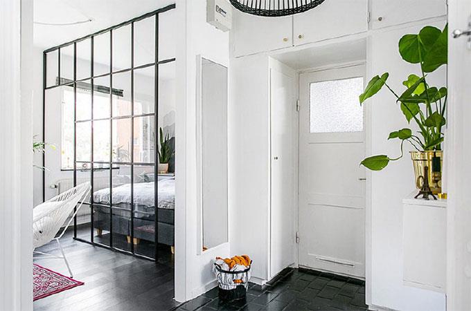 对于这对小夫妻的婚房,大概最适合用“麻雀虽小五脏俱全”这句话来形容。卧室、客厅、厨房都得到了一个合理的安排。整个房间主色调为极简的白色,让屋子更加通透明亮。进门右手边是卧室和小客厅,用通透的玻璃隔开,虽然隐蔽性不足,但是也增加了开阔性。