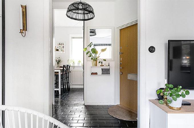 电视柜主十分简洁的白色搭配一点原木色彩,放置一盆绿植做点缀,充满了大自然的气息。而客厅对面正是厨房与卫生间,隔墙置物架上照样是充满生机的绿植,可见这对小夫妻不仅热爱生活,生活也是相当的有情趣。这个区域的灯饰选用了比较有设计感的,黑色线条感十足的灯罩,让整个极简的空间多了几分创意。