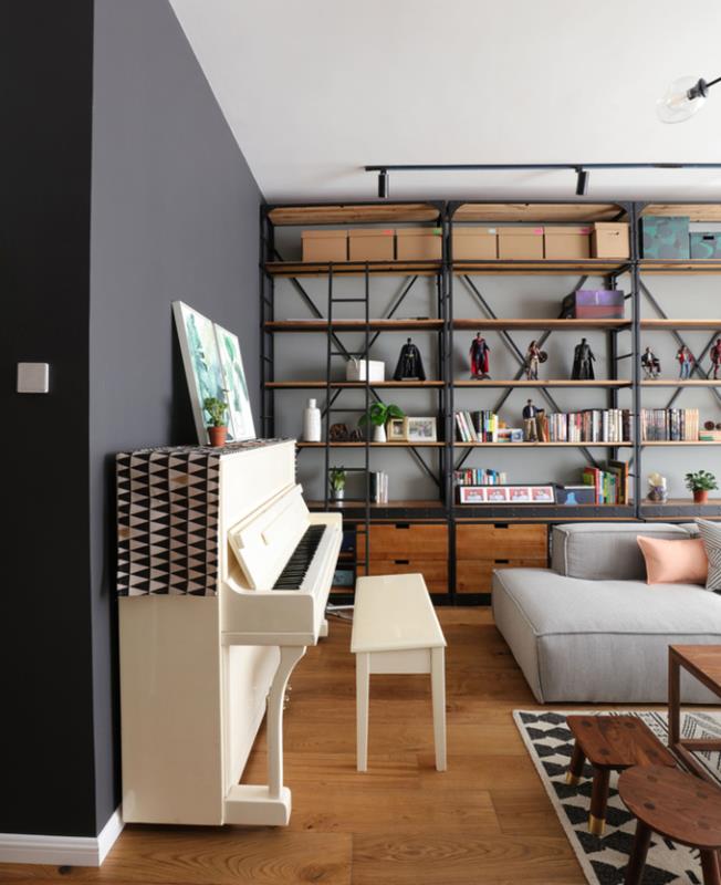 男主人是超级漫威迷,书架上摆满了漫威的漫画和手办,以及两人的结婚照。隔断墙和客厅之间留了一个不大的空间给女主人放钢琴,乳白色的钢琴,黑色的琴键,生活也流淌着浪漫和诗意。