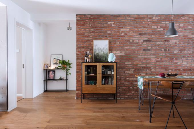 餐厅用红色的砖墙代替了白色的粉刷墙,砖块与砖块之间的缝隙,粗狂中呈现出有别于一般墙面的光影层次感。柜子和餐桌采用和地板统一色系的原木,给整个空间带来了一种老旧又摩登的视觉效果。