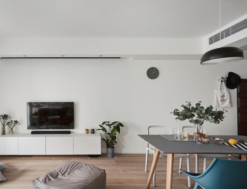 这套案例就是典型的北欧简约风设计,从客厅和餐厅的整体设计就可以看出这个屋子的面积确实是有限的。原本三房两厅两卫的89平的户型,两夫妻住起来并不舒适,甚至是有些拥挤。功能区复杂,空间不够通透,整体比较拥挤。改造后,主题色调简单纯碎,除了木地板,基本以白色为主,墙壁基本没有任何装饰,整个空间更明亮,更简单。