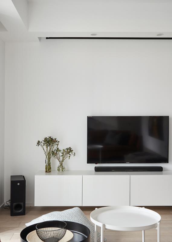 纯白的电视柜、纯白的墙壁浑然一体。黑色的音响、电视和吊顶装饰,与整个纯白空间形成强烈的对比,带给人视觉上的冲击。电视柜上简单的两束花,不娇艳不抢镜,低调的散发着勃勃生机。