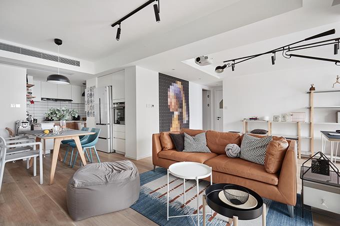 因为空间有限,设计师放弃了比较占地方的茶几,选择了两个简约而富有设计感的小桌子。起到置物作用的同时,有着强大的装饰作用。线条式的支架,从视觉上增加了空间感。地毯和布艺沙发则给简约的空间增添了几分色彩,不至于整个空间显得枯燥而乏味。简约黑色外观设计的照明灯,照明效果出色,且有着很好的装饰效果。沙发左后方墙上的“戴珍珠耳环的少女”,是全屋唯一的墙面装饰,艺术效果十分突出。
