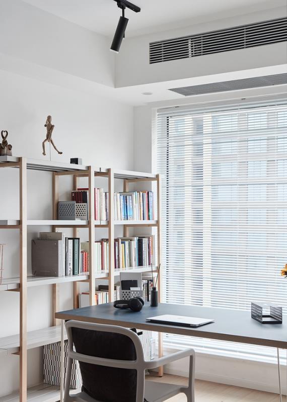 客厅沙发正背后是一个开放式的书房,因为只有小夫妻两,还算安静。简约的书桌正对着窗户,能享受到充足的光。简约骨架式书架,方便取放书籍,而且具有通透感,保证书房充足的光,而且避免空间小而产生压抑感。