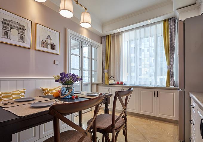餐厅的小清新中带了几分文艺,白色窗帘和白色橱柜有着几分欲语还休的味道,玻璃门富有线条感。餐桌是比较有味道的原木,加上墙上两幅壁画,让整个简约留白的空间多了几笔艺术色彩。