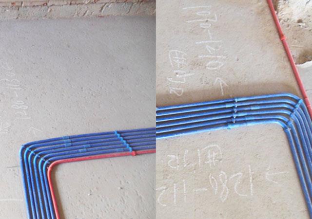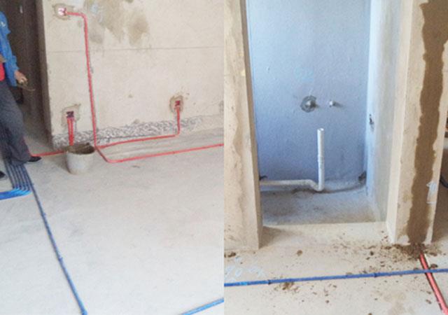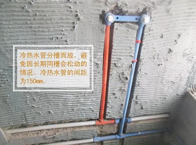 (2)水管开槽的深度是有讲究的,水管开槽深度规定为25mm,保证封槽后能应对水管的热胀冷缩,不会形成空鼓。冷热水管要保持150mm的科学间距.