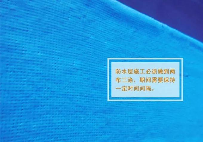 (4)地面要全部刷到,而且必须等第一遍干了后,才能刷第二遍。久居装饰采用专用创新型蓝色涂料,全方位立体涂刷三遍。防水层施工做到两布三涂。