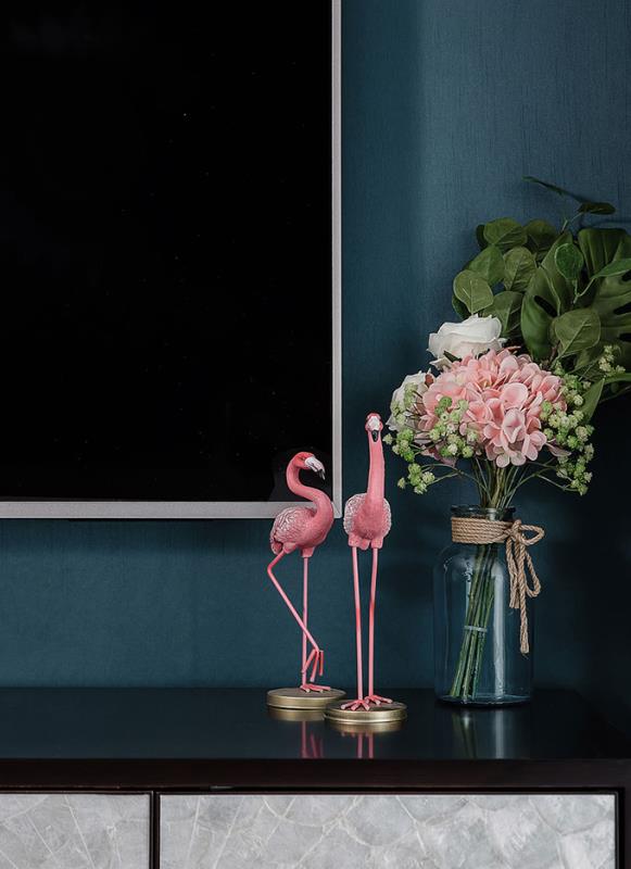 电视柜上的火烈鸟摆饰非常的亮眼,粉红色的火烈鸟和一束花,点亮了整个客厅。让整个冷色系的空间,一下子温暖浪漫起来。