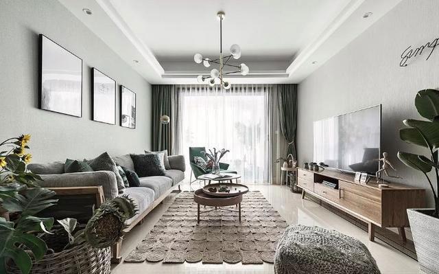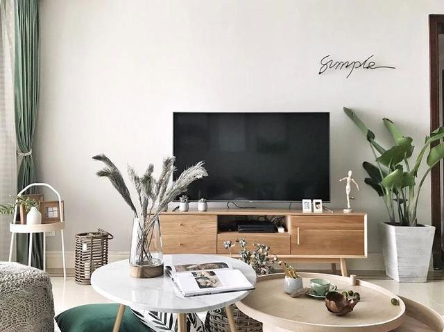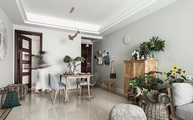 客厅与餐厅两个空间,是连通的。用一个原木材质的餐边柜作为空间分隔,外加几盆层次分明的绿植,把两个区域分隔开来!因为房主喜欢植物,喜欢绿色,于是整个空间就以不同层次不同质地的绿色做基调,打造出自然、舒适的生活空间。