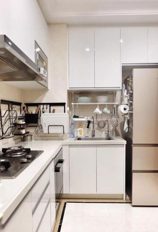 厨房面积不算大,设计了不同种类的挂钩,台面能挂的物件统统都上墙了。橱柜的设计,收纳空间很大,不同种类的用品规放到不同的柜子中,整洁,方便。